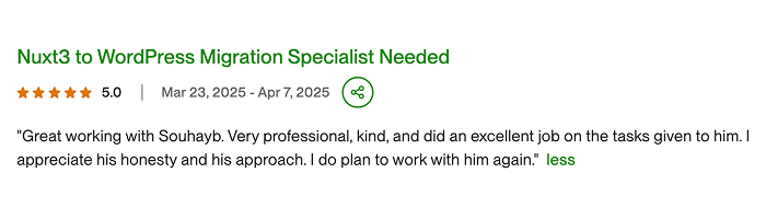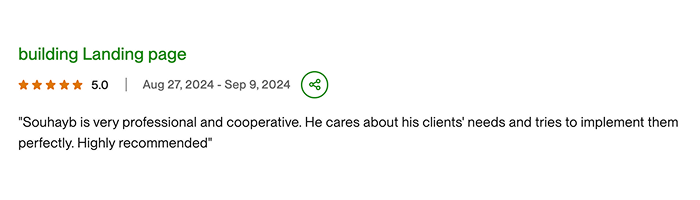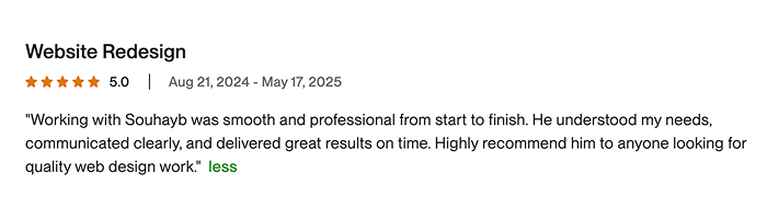 "Excellent work! souhayb built a fantastic website for me. he was professional, efficient, and delivered exactly what I needed"
