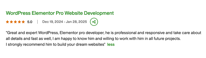 "Great and expert WordPress, Elementor pro developer, he is professional and responsive and take care about all details and fast as well, I am happy to know him and willing to work with him in all future projects. I strongly recommend him to build your dream websites"