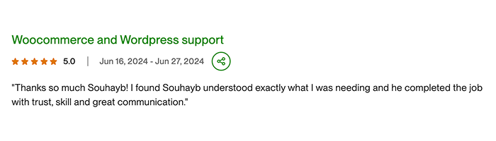 "I had the pleasure of working with Souhayb on creating an Arabic eCommerce site through WordPress, and I couldn't be happier with the results. He was incredibly professional, knowledgeable, and responsive throughout the entire process. His attention to detail and ability to bring my vision to life exceeded my expectations. Not only did he deliver a high-quality website, but he also provided valuable insights and guidance to ensure everything ran smoothly. I highly recommend Souhayb to anyone looking for a skilled and reliable developer. Thank you for your excellent work!"